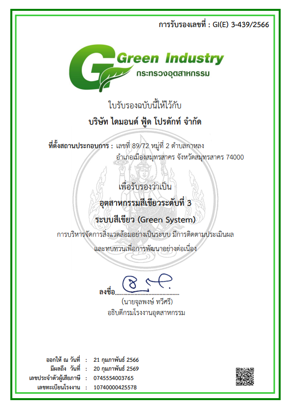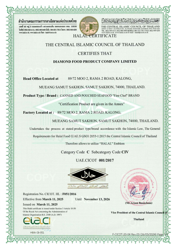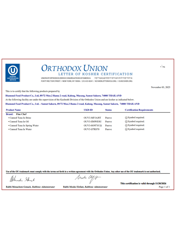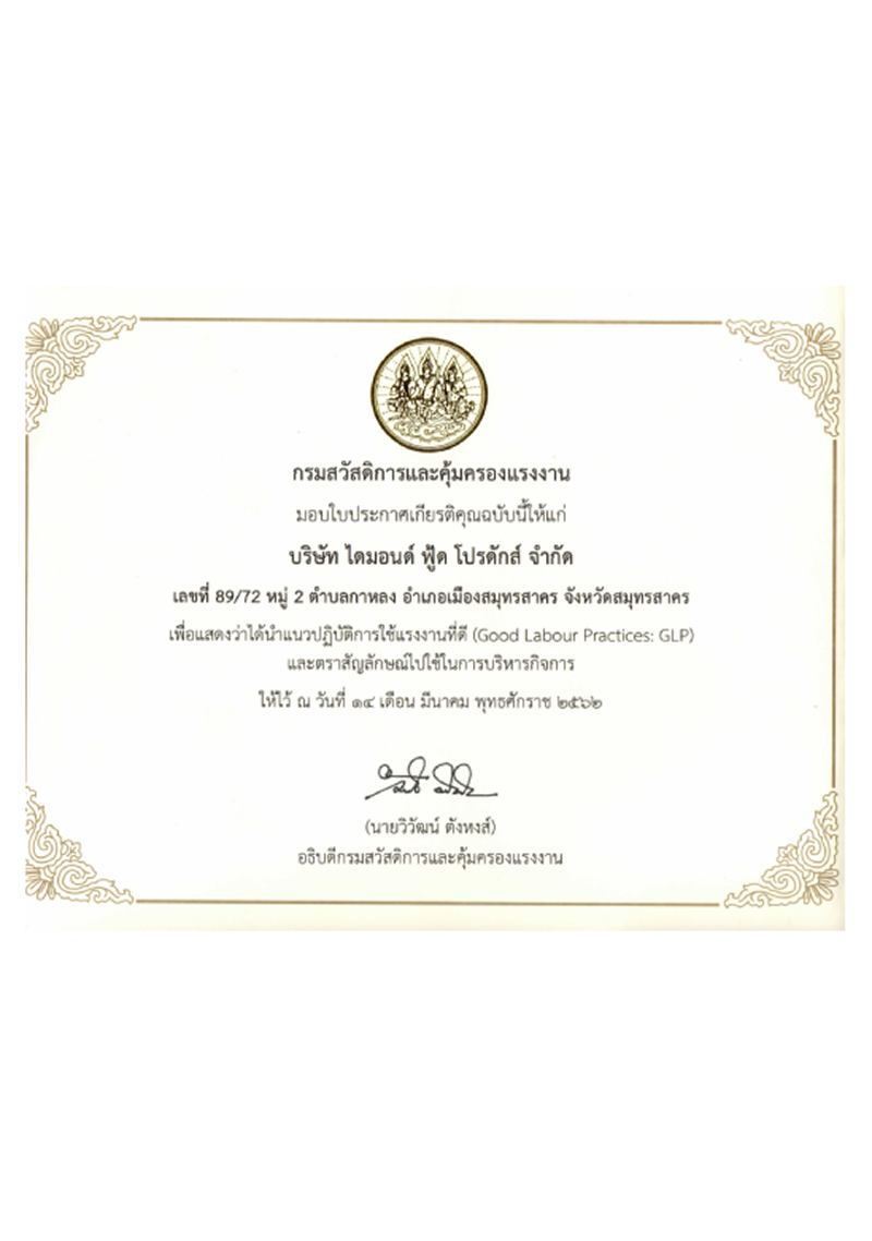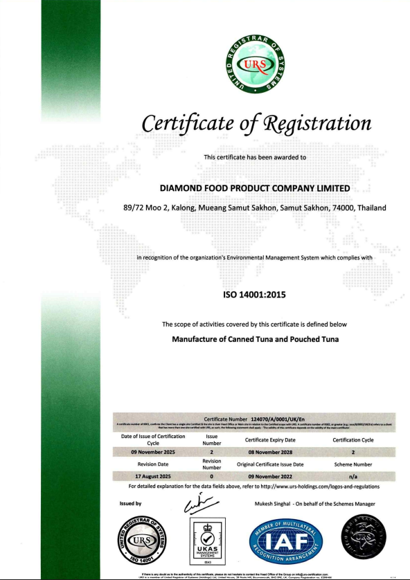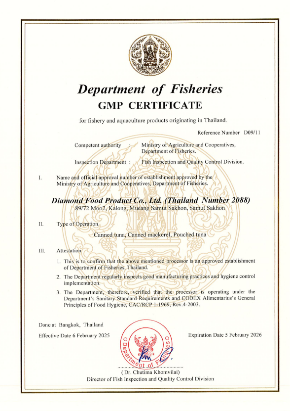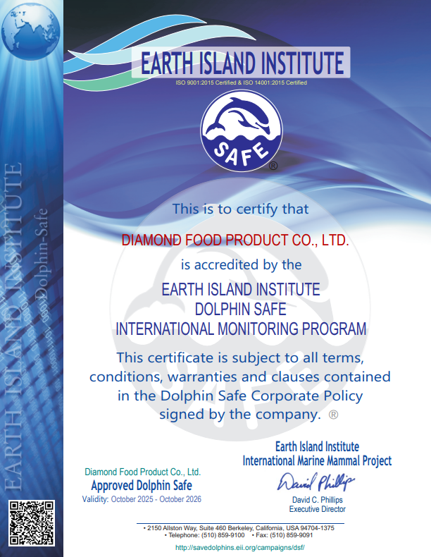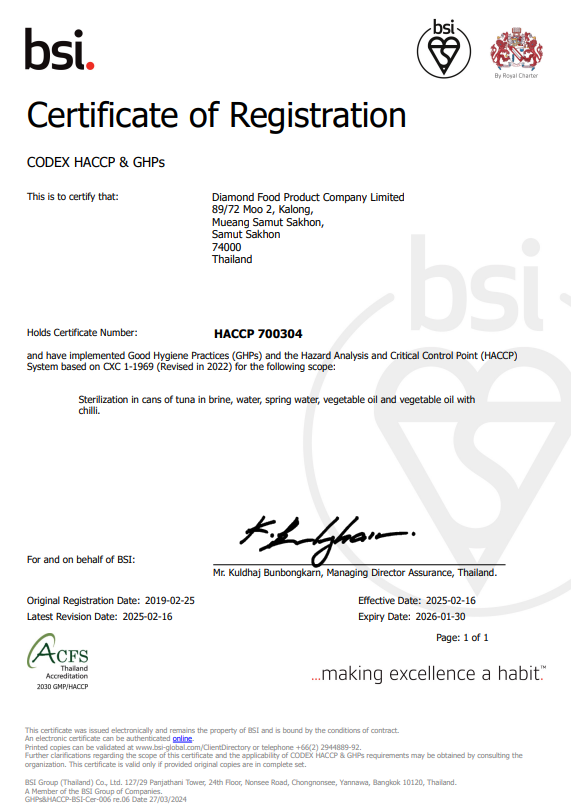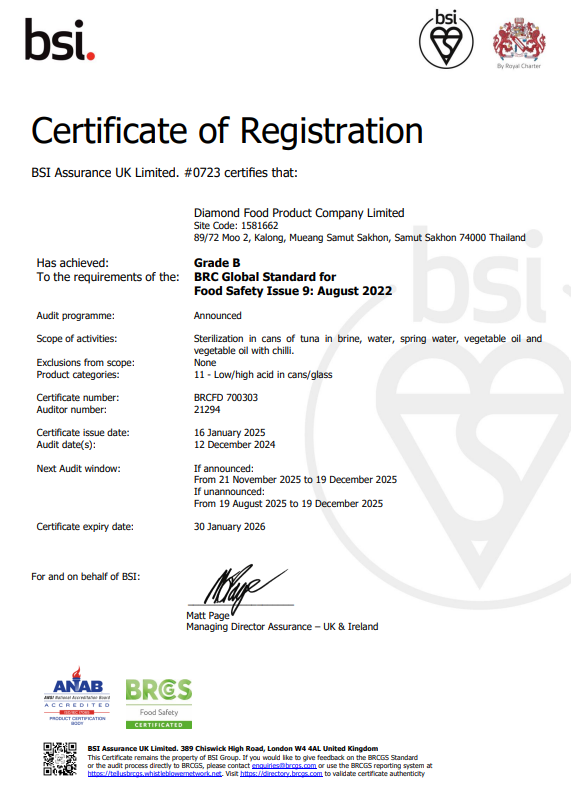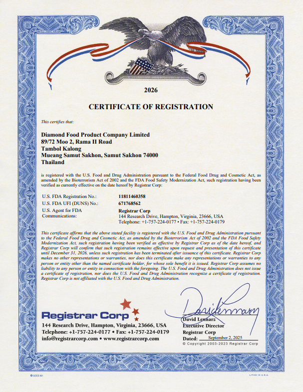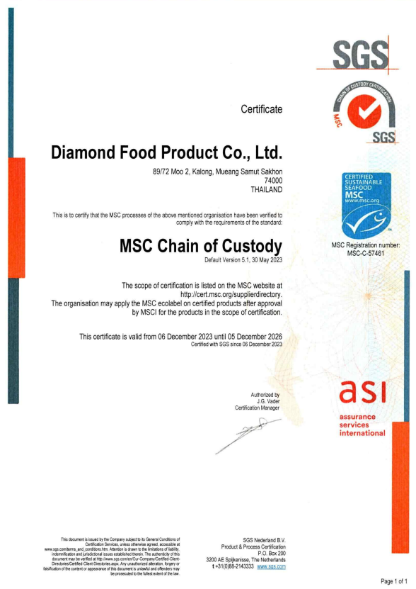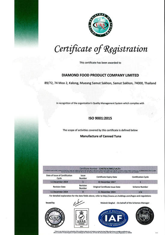 ด้วยประสบการณ์และความทุ่มเทในการดำเนินธุรกิจมากว่าทศวรรษ บริษัท ไดมอนด์ฟู้ดโปรดักท์ จำกัด ได้เป็นที่ยอมรับด้านมาตรฐานสากล โดยผ่านการรับรองจากสถาบันชั้นนำทั้งในประเทศและต่างประเทศ อาทิ GMP, GHP, HACCP, ISO9001, ISO14001, BRC, Orthodox Union (OU), Halal, และ Marine Stewardship Council (MSC)